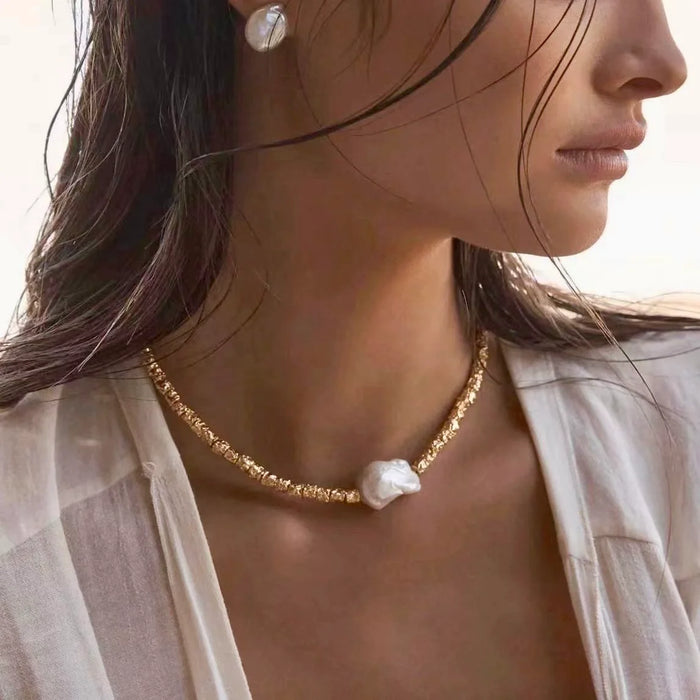 Discover the poetic beauty of natural baroque pearls in this bold yet refined statement necklace. Crafted with a textured 18K gold-plated copper chain, each piece showcases luminous freshwater pearls that are organically shaped and utterly unique—no two are ever the same.