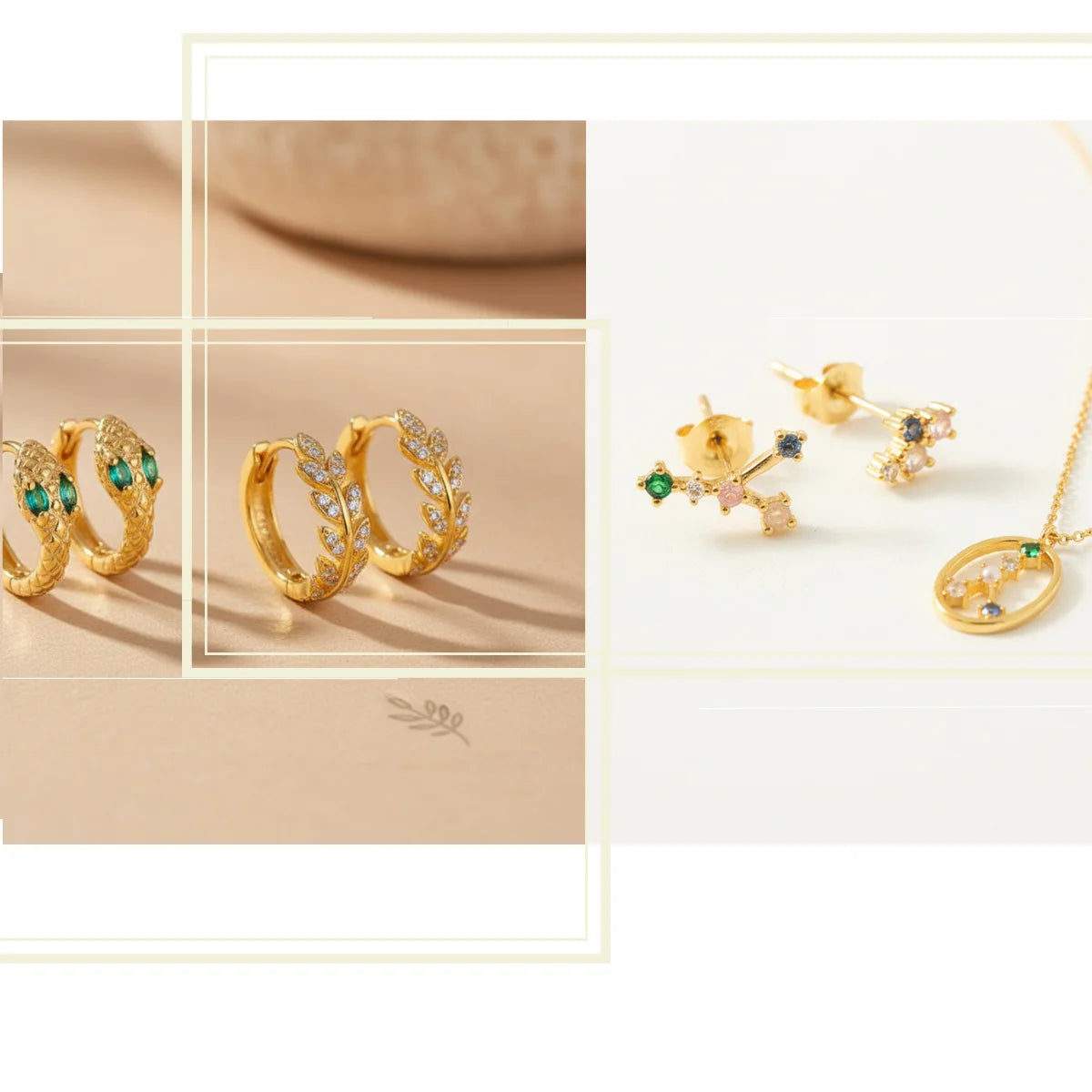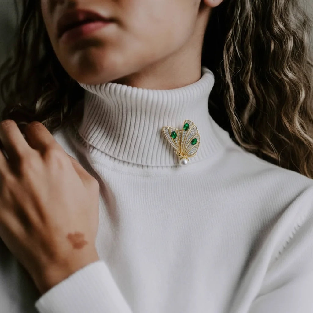 As shown here, the sparkling gold and green details stand out beautifully against soft knitwear — creating a warm, refined look perfect for everyday outings, festive gatherings, or cozy holiday moments.