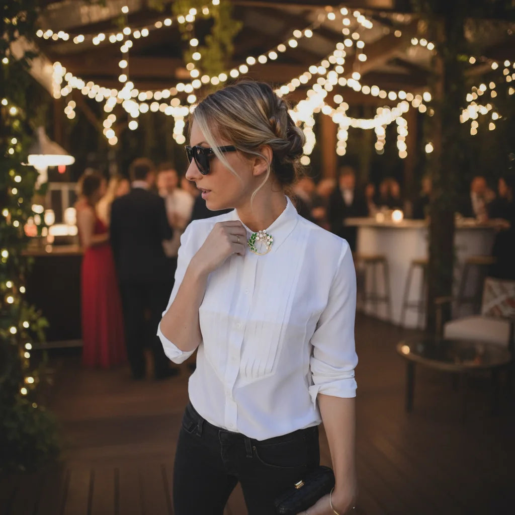 Pinning a brooch at the collar instantly elevates a simple blouse into a chic evening look.