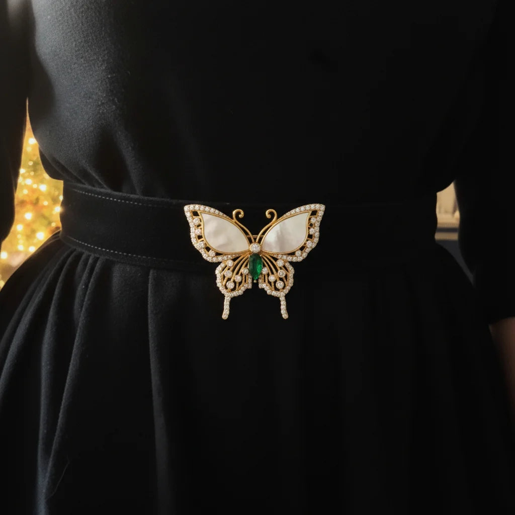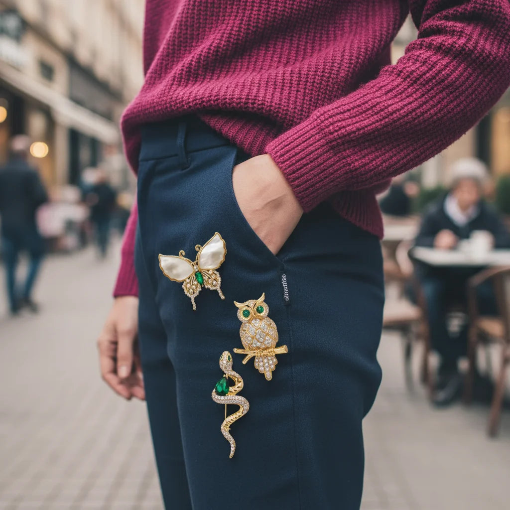 As shown here, a cluster of brooches worn on tailored trousers adds a chic, unexpected twist — perfect for city strolls, café dates, or festive gatherings.