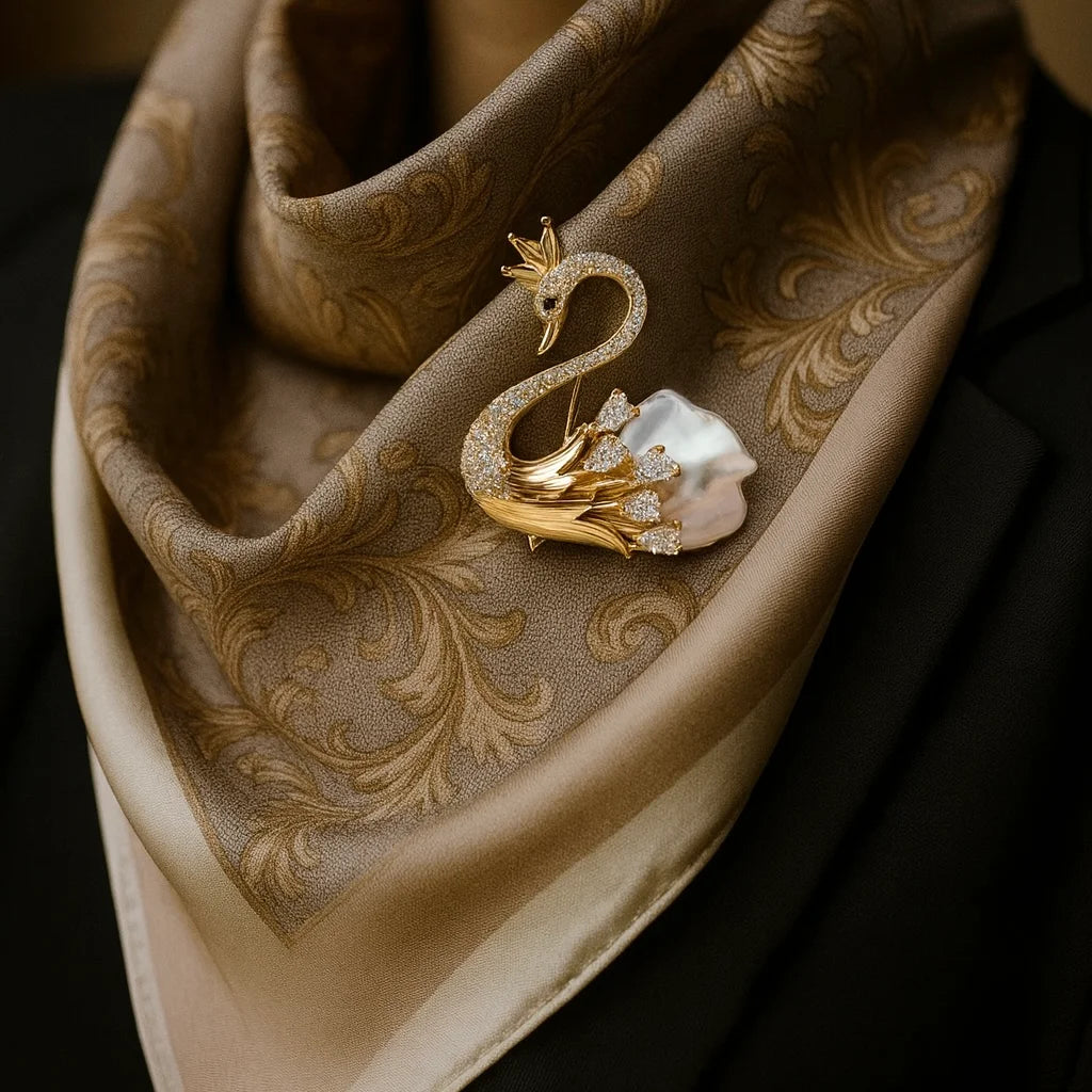 Pinning a statement brooch onto a silk scarf creates a refined, graceful focal point — perfect for special dinners, festive gatherings, or elevated daytime outfits.
