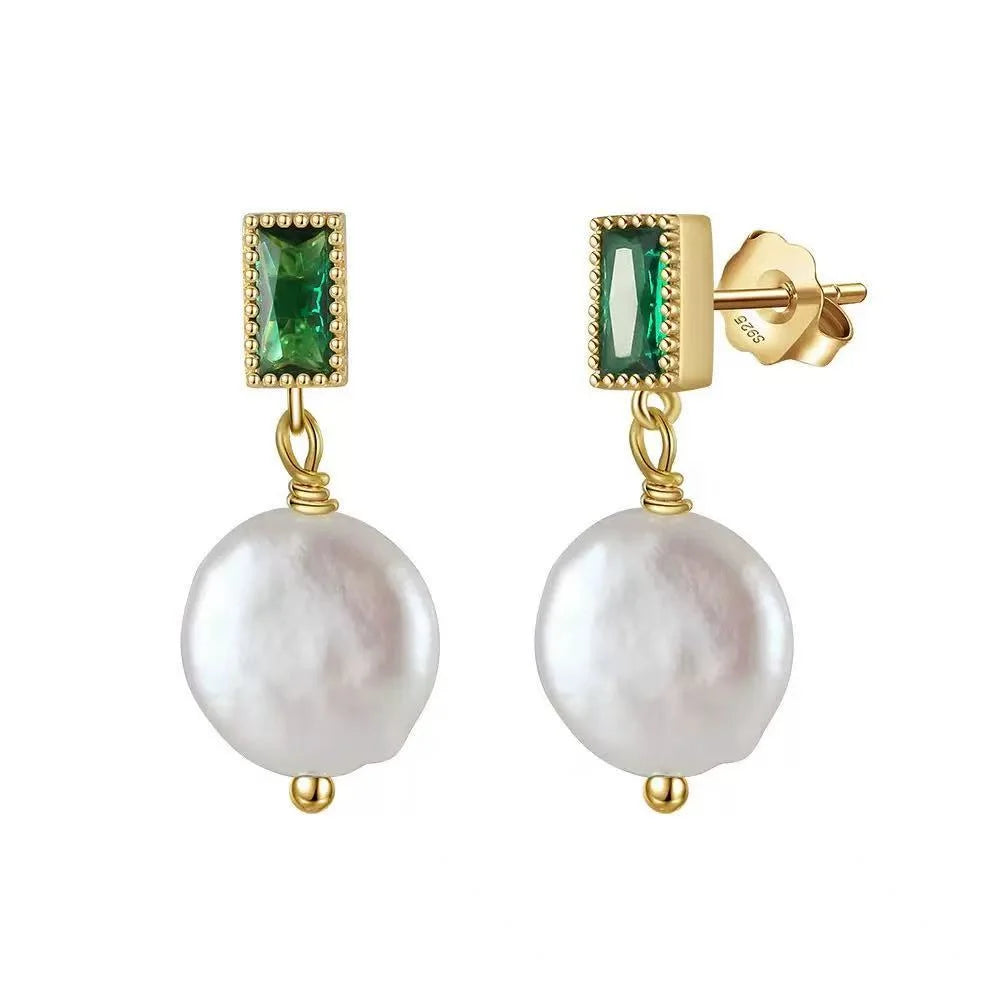 These Green/Red/White Crystal & Freshwater Coin Pearl Drop Earrings strike a perfect balance between modern elegance and natural beauty. Each earring features a vivid emerald-green baguette crystal set in gold-plated 925 sterling silver, framed with delicate bead detailing for a refined vintage touch.