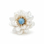 Hand-assembled with layers of natural baroque freshwater pearls, each petal shines with organic lustre and unique character, circling a tranquil sky-blue gemstone at the heart.