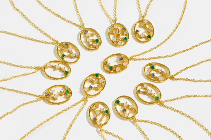Birth Constellation Necklace – 12 zodiac variants; gold finish with crystal-set constellations, adjustable chain.