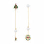 One earring features a sparkling snowflake charm adorned with green and red stones, paired with luminous freshwater pearls along a delicate gold-plated chain.