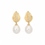 Each earring features a delicately sculpted golden leaf, textured with organic veins and adorned with a sparkling line of zircon diamonds—adding refined brilliance and a luxurious finish. Suspended beneath the leaf is a luminous baroque freshwater pearl, uniquely shaped by nature and celebrated for its soft glow and individuality.