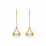 Each earring features a luminous high-lustre freshwater pearl, delicately wrapped in matte-gold petal-style metalwork that creates a soft, sculptural silhouette. The long, slender chain adds fluidity and elongates the neckline, making these earrings perfect for both everyday refinement and formal occasions.