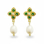 These Gold Stud Pearl Earrings with Green Gemstones blend regal charm with timeless elegance. The stud features a four-petal floral motif, each petal set with a vivid green gemstone framed in delicate gold beading. At the center lies a subtle white crystal that adds a refined sparkle.