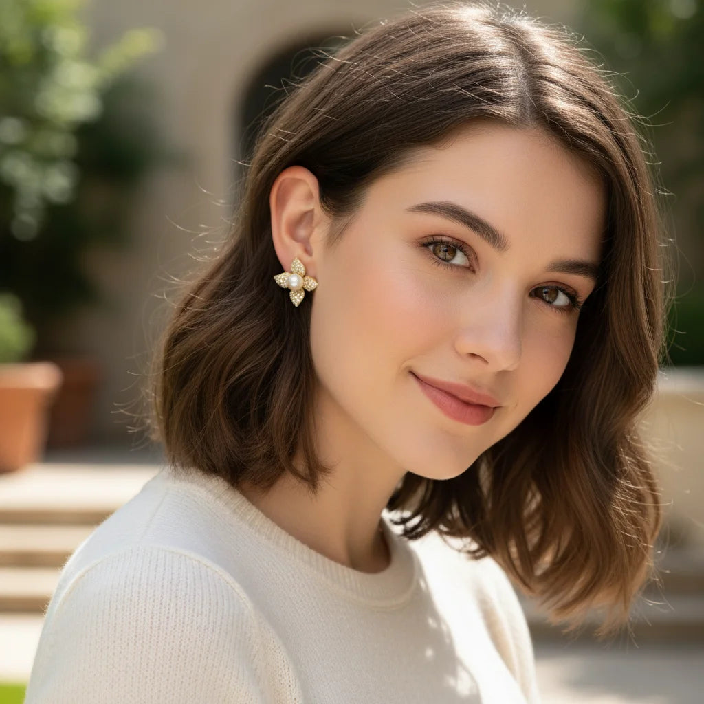 These Floral Crystal Pearl Stud Earrings capture the essence of timeless femininity with a touch of luminous elegance. Each earring features a radiant freshwater pearl set at the center of a four-petal flower, surrounded by sparkling micro-pavé crystals that bring captivating brilliance from every angle.