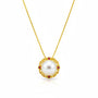 Crafted from S925 sterling silver with rich 18K gold plating, this pendant features a radiant freshwater pearl surrounded by engraved filigree patterns and accented with red zircon stones — a graceful balance of warmth and brilliance.