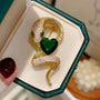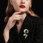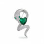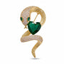Striking and symbolic, this Serpent Heart Brooch is a statement of power, protection and desire. The sculptural snake coils gracefully around a heart-shaped emerald-green crystal, representing eternal love guarded by strength and wisdom.