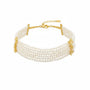 This beaded multi-strand shell pearl choker necklace draws inspiration from timeless elegance and baroque artistry. Featuring 7 rows of natural pearls, interspersed with blooming gold vermeil floral accents, it captures the romantic poise of nature’s quiet strength. Perfectly hugging the neckline, it adds a bold yet delicate charm to any look.