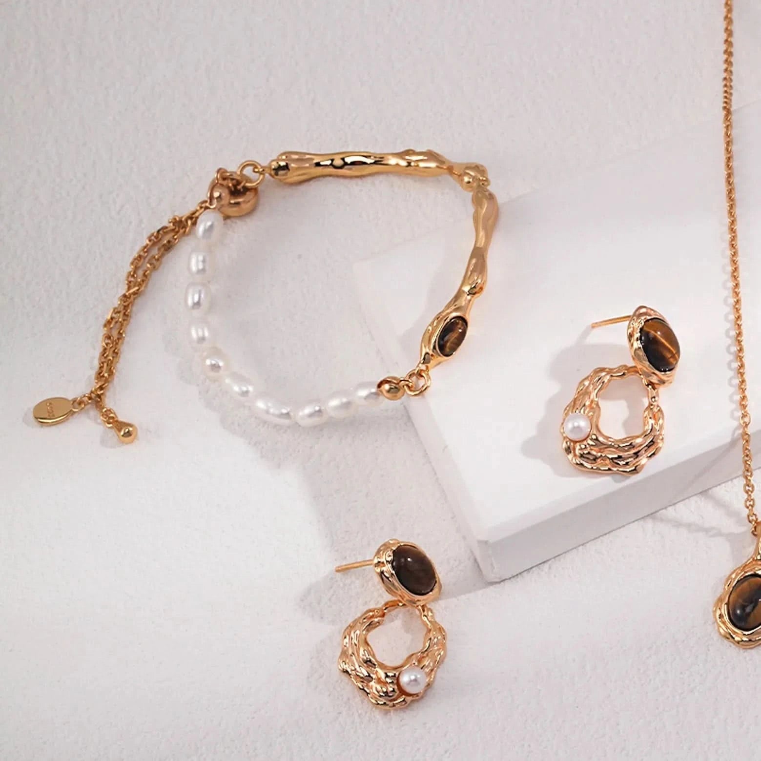 These Tiger Eye Seed Pearl earrings capture light from all angles with their multi-faceted design and shimmering finish. They feature a timeless teardrop shape with a beautifully polished yellow tiger eye stone, finished with an elegant pearl drop. Perfect for adding a touch of sophistication to any outfit.