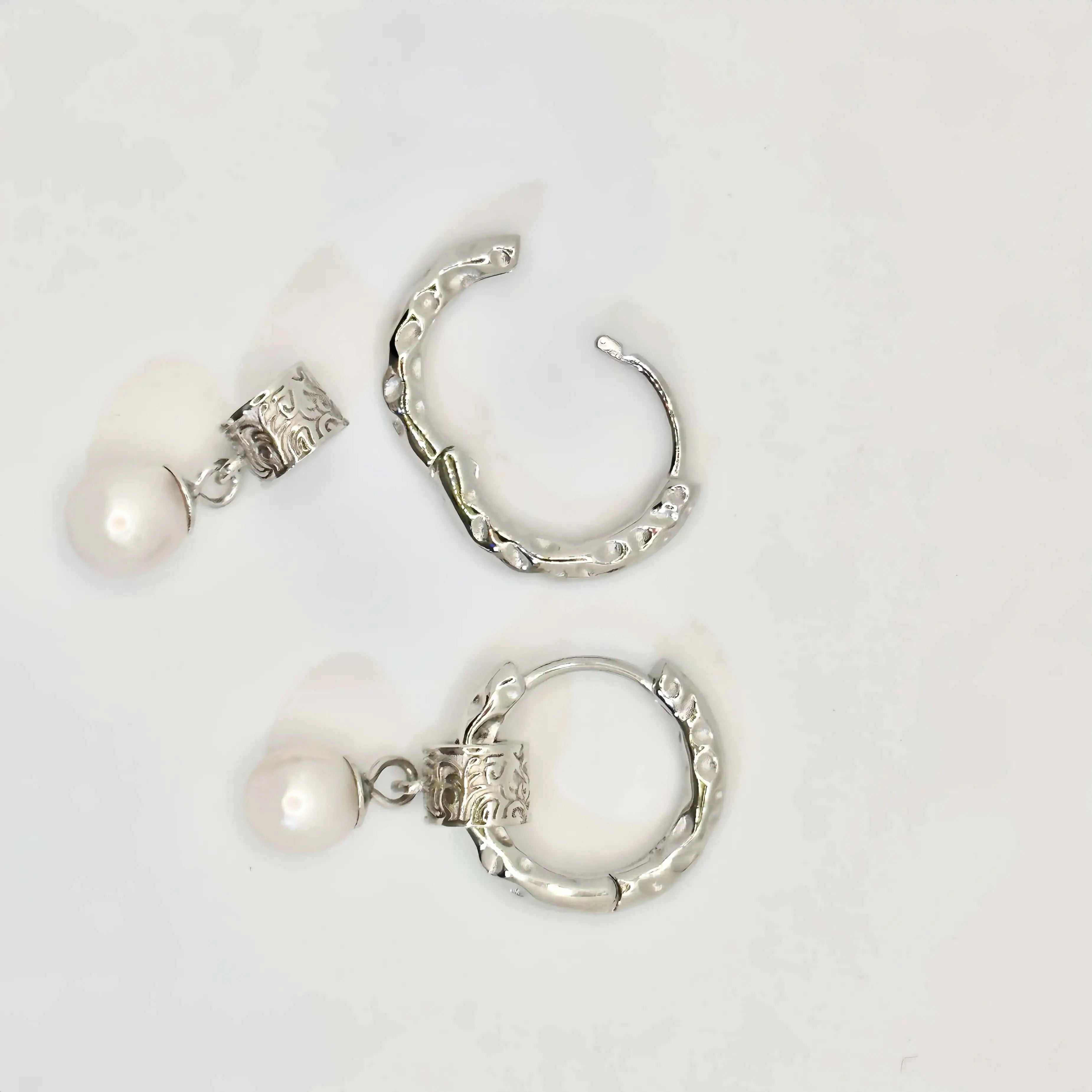Each earring features a finely textured S925 silver hoop with delicate vintage-style engravings, paired with a luminous freshwater pearl drop that adds softness and elegance to the bold silhouette. The detachable design allows you to enjoy two looks in one: