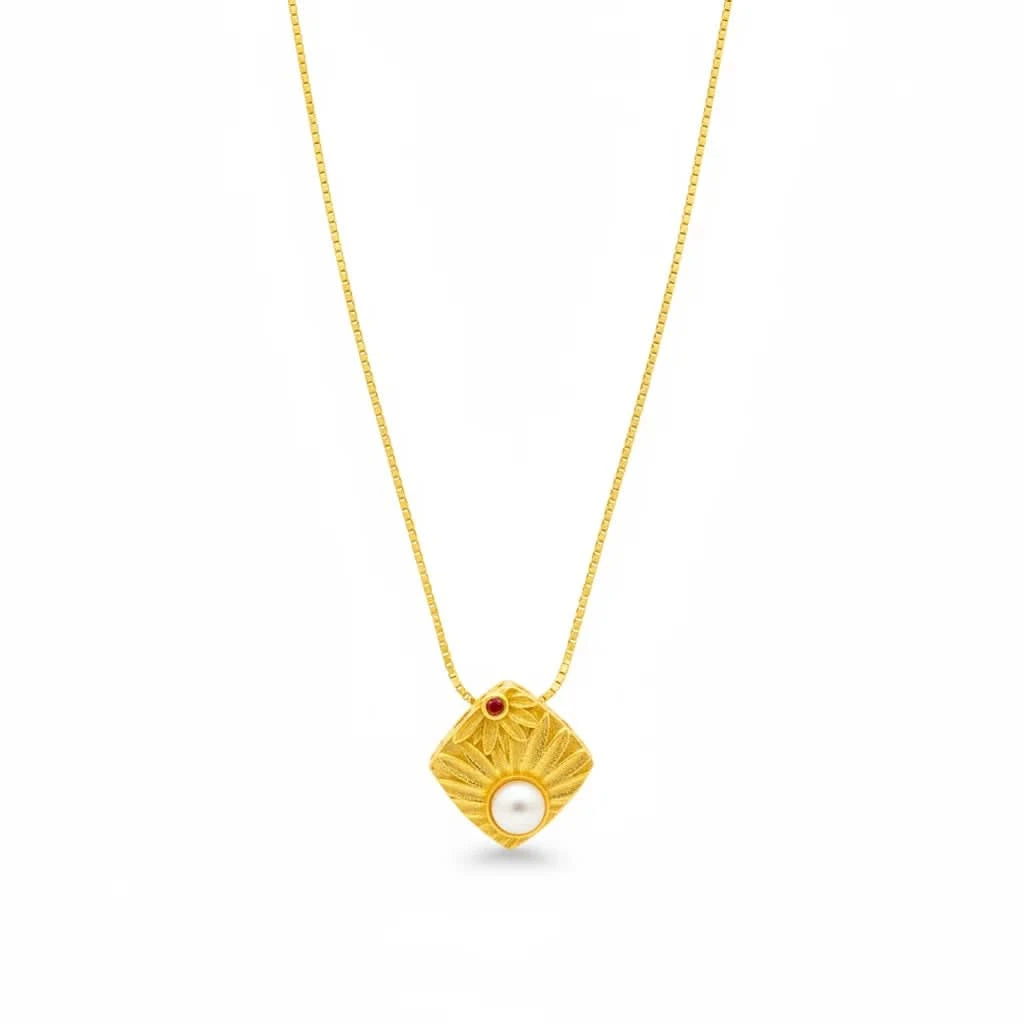 Meticulously handcrafted from S925 sterling silver and finished with 18K gold plating, this necklace features a geometric engraved pendant accented by a luminous freshwater pearl and a subtle red gemstone detail — a symbol of sophistication and quiet strength.